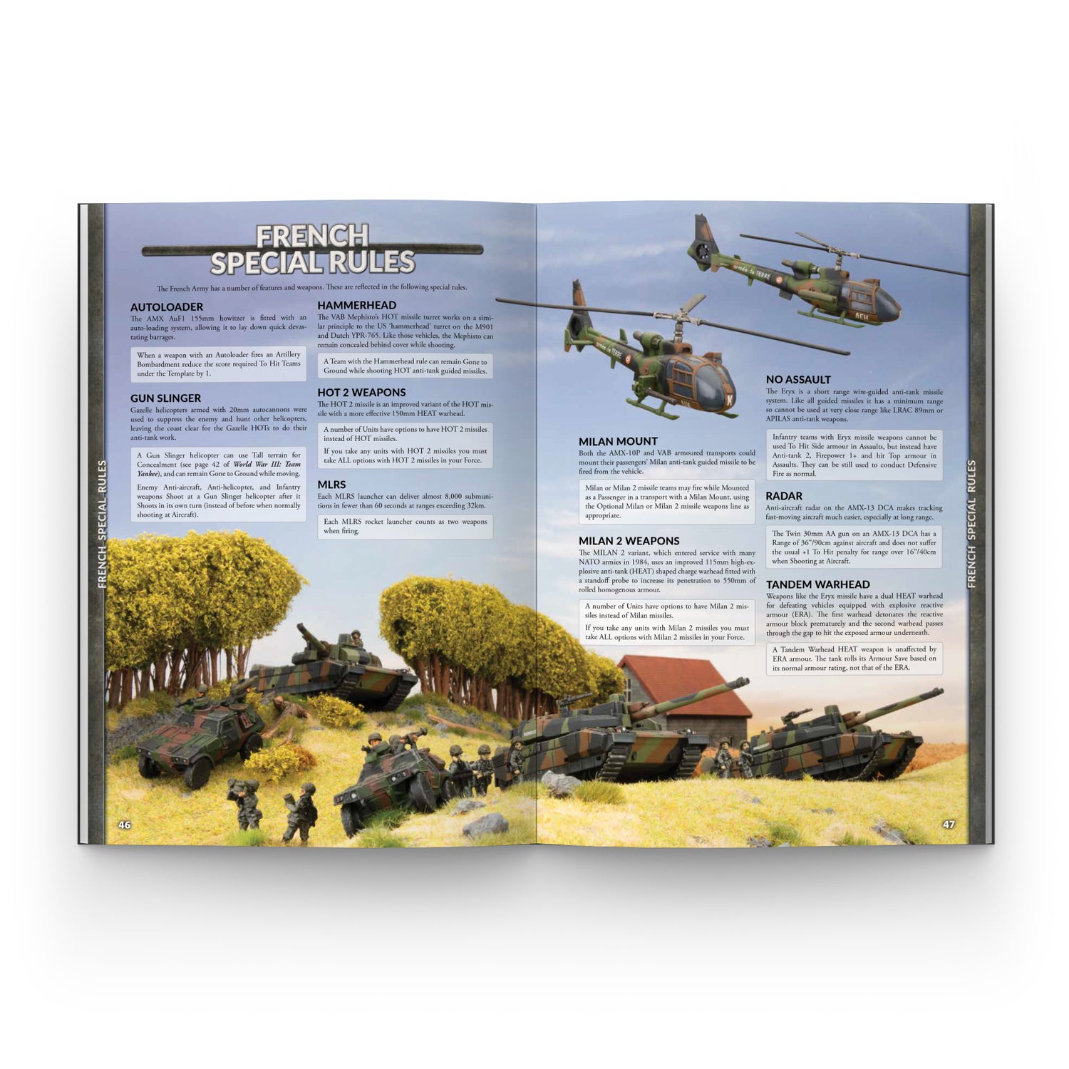 Recon options include the Canadian Lynx and Dutch M113 C&V tracked vehicles, Belgium Scimitars and Scorpions, and the heavily armed French AMX-10 RC armoured car and lighter VBLs. Among the many support choices there are Canadian, Dutch, and Belgian M109 artillery, French rapid fire AMX AuF1 SP 155mm howitzers, Canadian ADATS, French Roland and Mephisto, and Dutch PRAT missile vehicles.